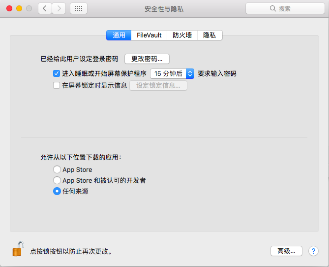 然后在⌈系统偏好设置⌋ > ⌈安全与隐私⌋ 中选择 ⌈任何来源⌋。安装完毕后,为了安全考虑,最好能够再选择回来自可信任的开发者。