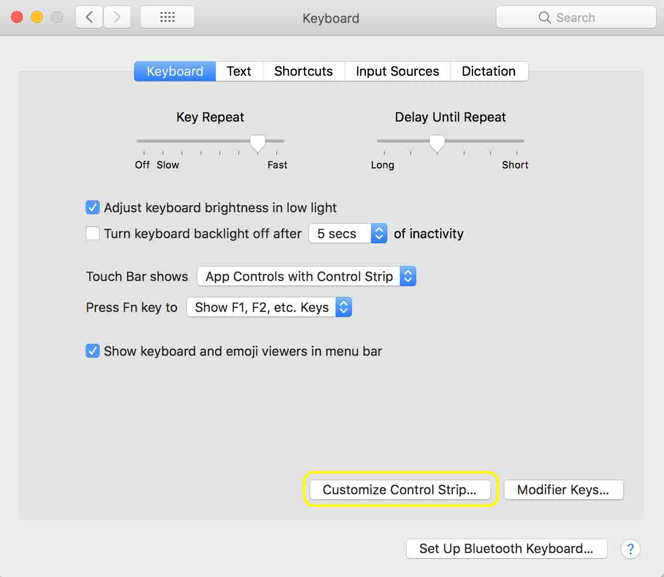 ⌈系统偏好设置⌋ > ⌈键盘⌋ > ⌈键盘⌋ > 点击⌈自定义控制条⌋ 即可进行设置。