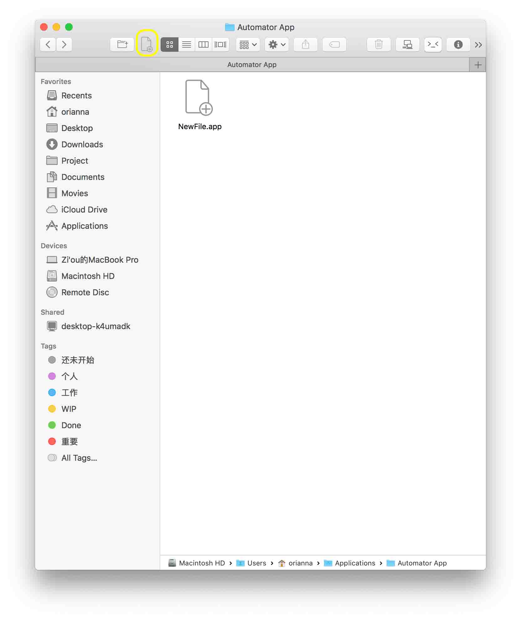 打开两个Finder窗口,平铺。打开⌈显示⌋ >⌈自定义工具栏⌋,将新建的NewFile.app图标拖到工具栏上。之后就可以直接在Finder窗口点击图标生成新的文件了,也可以使用spotlight使用NewFile新建文件。