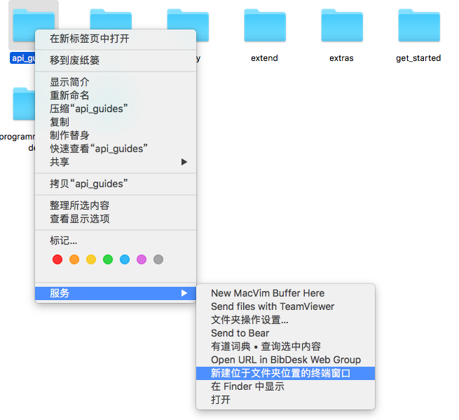 这样在Finder中选中文件夹,双指右击,就可以在服务中看到打开终端的选项。